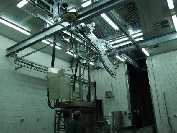 Przenośnik różnicowy przeznaczony jest do podnoszenia tusz wieprzowych z tapczanu wyrzutowego boksu głuszenia na tor wykrwawiania lub stołu doczyszczania szczeciniarki na konwojer obróbki poubojowej. Przenośnik różnicowy może transportować zarówno z niższego poziomu na wyższy i odwrotnie z wyższego na niższy. Całość wykonana jest ze stali nierdzewnej i ocynkowanej.