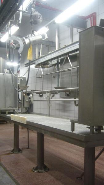 Przenośnik tacowy jelit przeznaczony jest do transportu jelit i ośrodków ze stanowiska wytrzewiania do jeliciarni. Przenośnik posiada tace, na które kładzie się jelita oraz haki do zawieszania ośrodków. Ruch przenośnika jest ściśle związany z ruchem konwojera głównego.